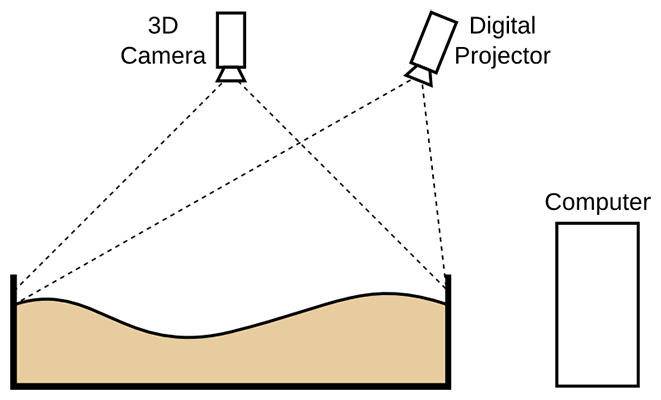 we are primarily developing 3D visualization applications to display earth science concepts, we also built a hands-on exhibit combining a flooding box, and virtual topography and water created using a closed loop of a Microsoft Kinect 3D camera, powerful simulation and visualization software, and a data projector. The resulting flooding box allows users to create topography models by shaping real sand, which is then augmented in real time by an elevation color map, topographic contour lines, and simulated water.
